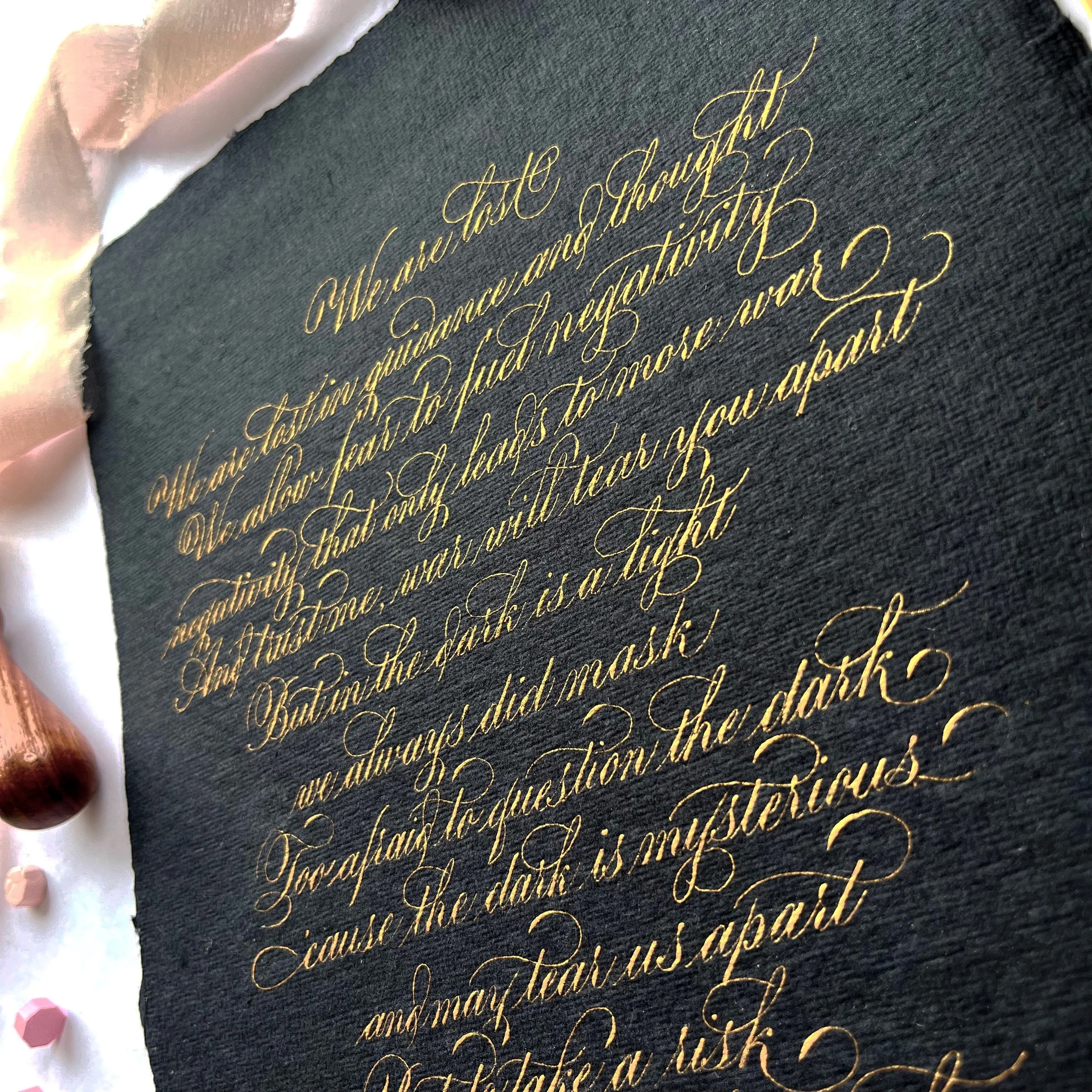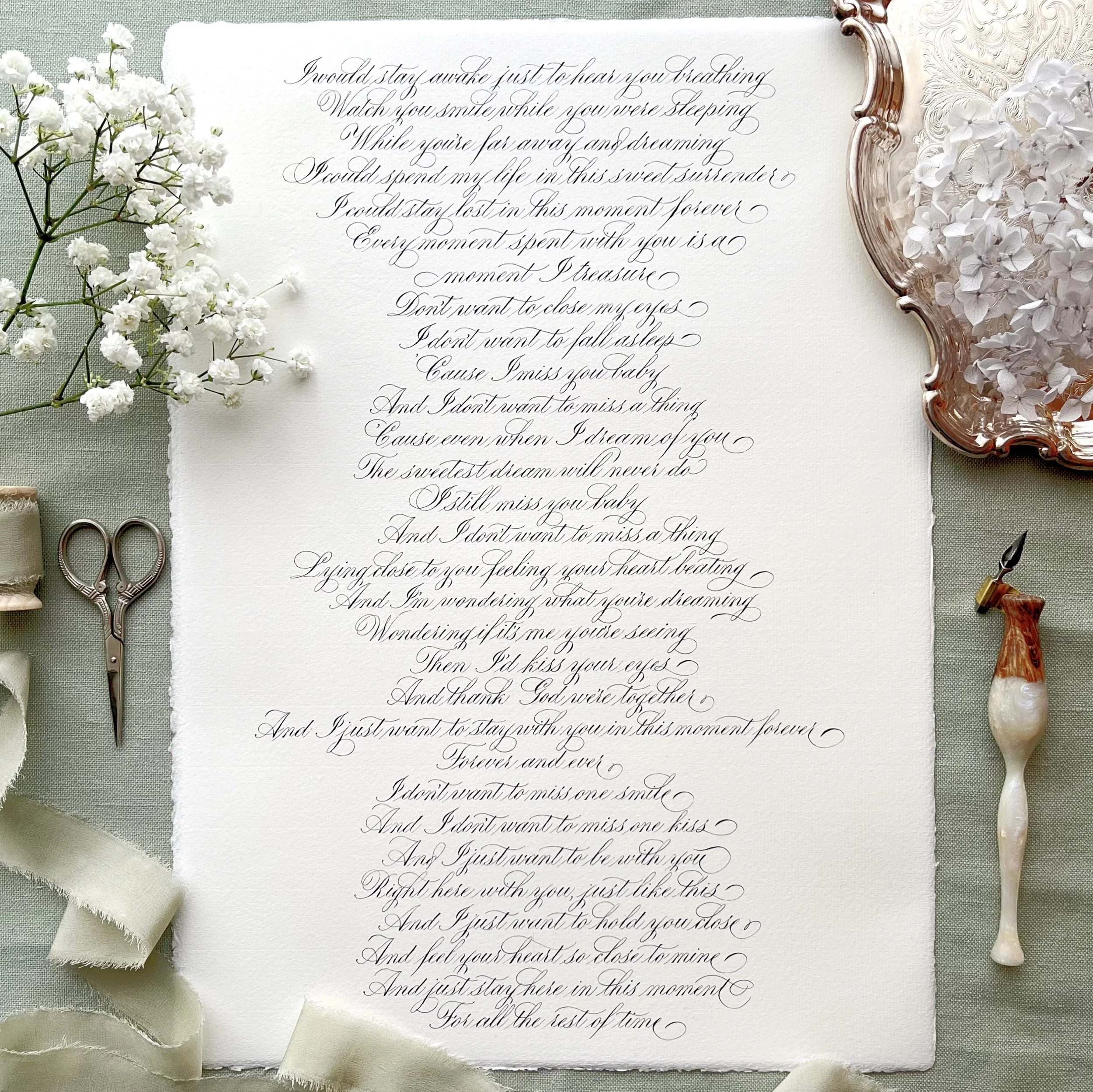 Commission a completely customised, original calligraphy artwork of your favourite quote, poem, song lyric, bible verse or wedding vows. Handwritten in elegant calligraphy on high quality watercolour paper or beautifully textured handmade paper sourced from Italy and India. A one of a kind and personal gift for a wedding anniversary, birthday or a way to beautify your home with words that are meaningful to you.